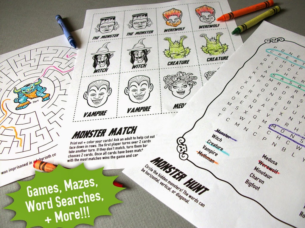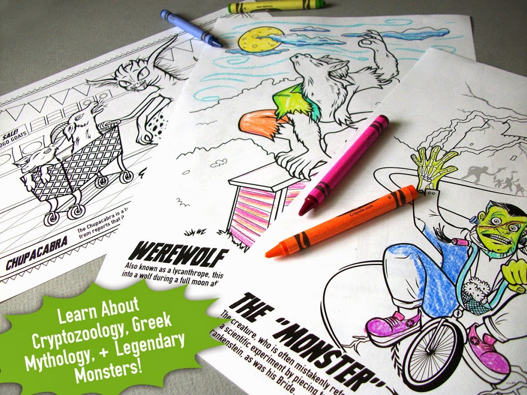 Back to the coloring book…our super fun set of coloring pages is filled with cryptozoology, greek mythology, and legendary monster games, mazes, word searches, and more!!! It’s not just a boring old coloring book! Crypto & mythology facts will be spread throughout so your little ones can learn about some of the most famous monsters like Nessie, Bigfoot, & the chupacabra. It’s a kid-friendly book though, so the artwork won’t induce nightmares! At least we tried to draw monsters that wouldn’t have scared us when we were kids.